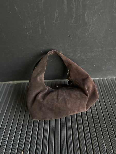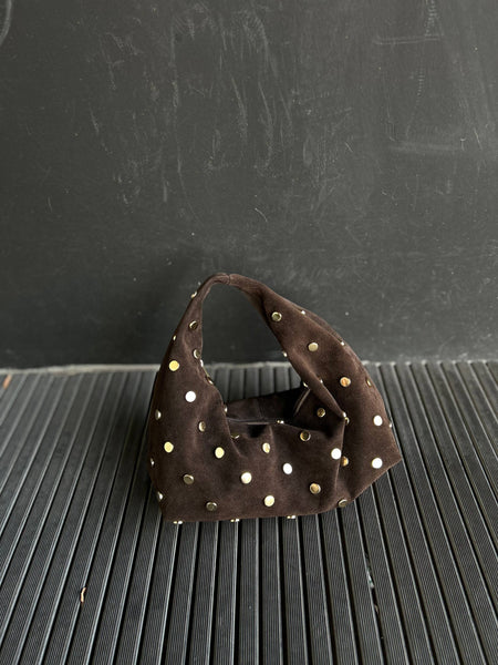 Soft suede mini bag with a short handle. Decorated with round metallic studs all over.