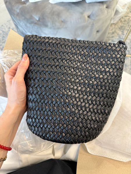 Woven shoulder bag with adjustable knot strap. Clean shape and versatile design.