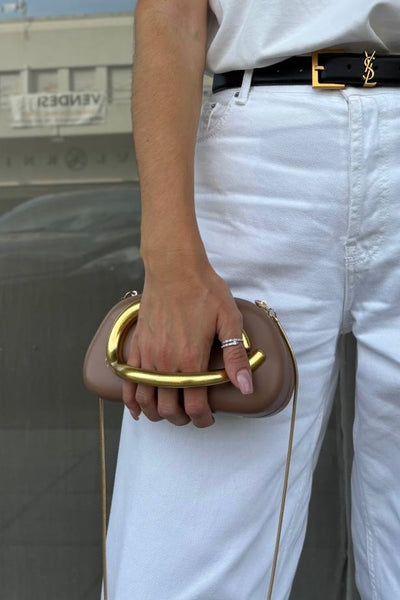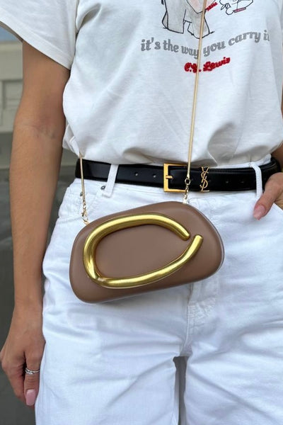Structured clutch with metal handle. Thin chain crossbody strap.