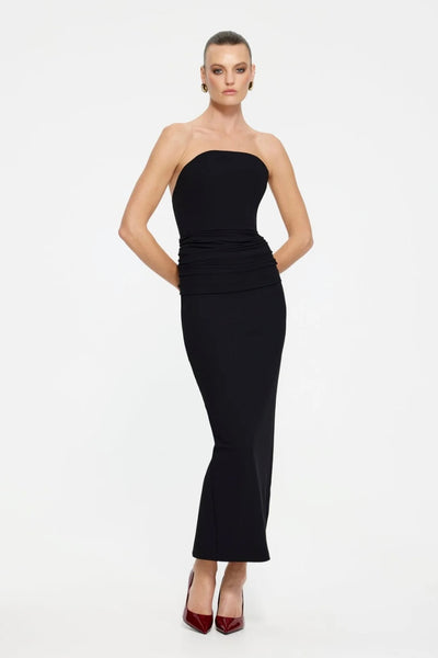 Strapless gown with a curved neckline and delicate ruching along the hips for a sculpted silhouette. Features a back slit for ease of movement. Minimal yet striking.