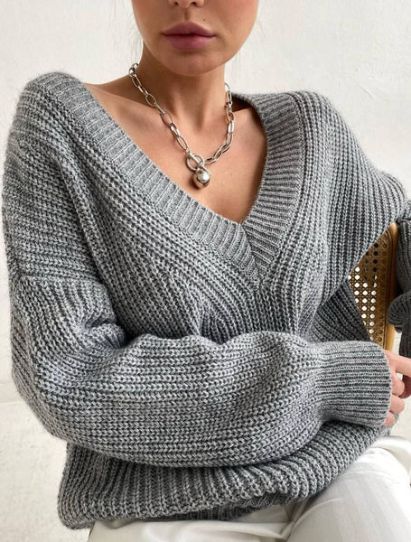 Oversized rib-knit sweater with a deep V-neckline and relaxed silhouette. Structural knit lines create a subtle sculpted effect.