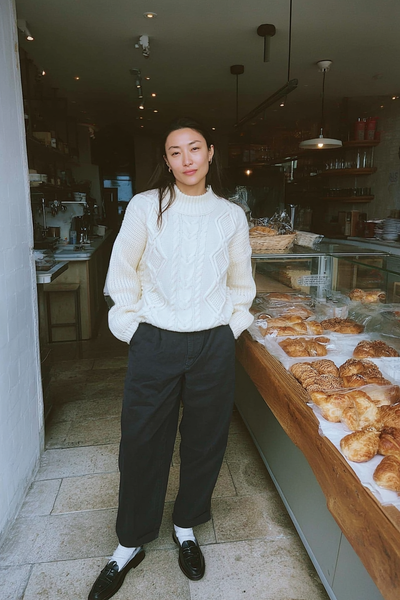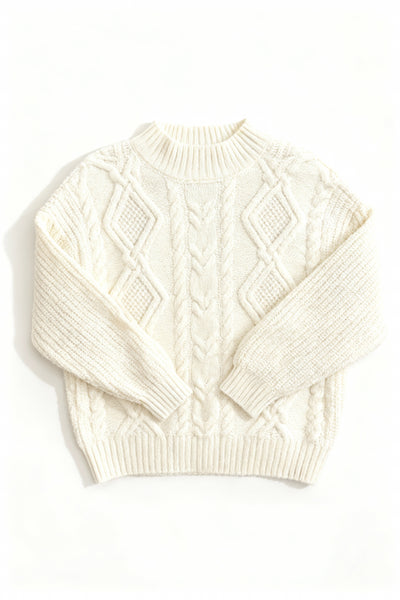 Relaxed-fit textured knit sweater with a high neck. Features prominent cable detailing across the front and soft, dense knit construction.