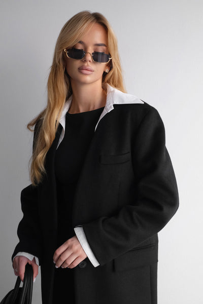 Long wool coat with detachable white collar and cuffs. Can be worn two ways — classic black or with contrasting white details for a sharper look. TF016