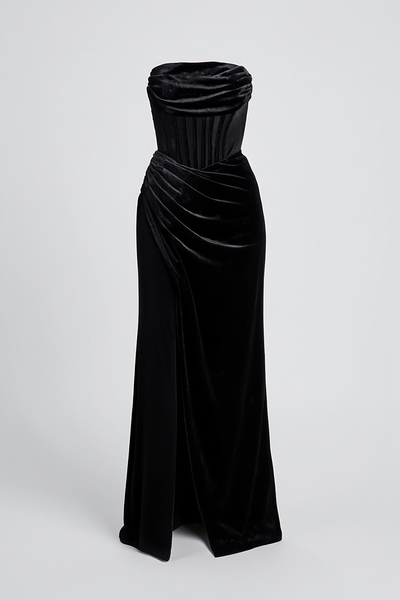 Velvet strapless gown with corset bodice and soft draping. High slit and extended back train create an elegant and striking silhouette.