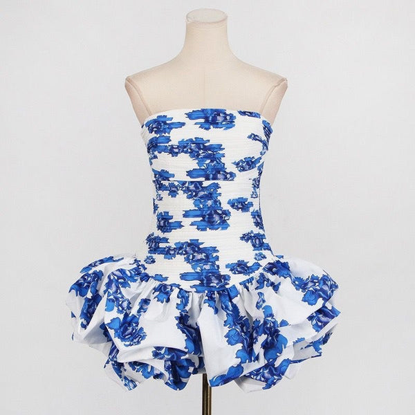 Strapless mini dress with a draped bodice and statement voluminous skirt. The contrast floral print creates a striking silhouette.