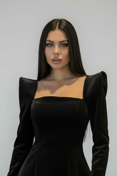 Velvet dress with structured shoulders and a square neckline. The contrasting hem adds a striking and dynamic touch.