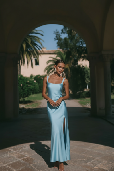 Straight-cut dress with a square neckline and high side slit. The silky sheen of the fabric creates a sleek and refined silhouette.