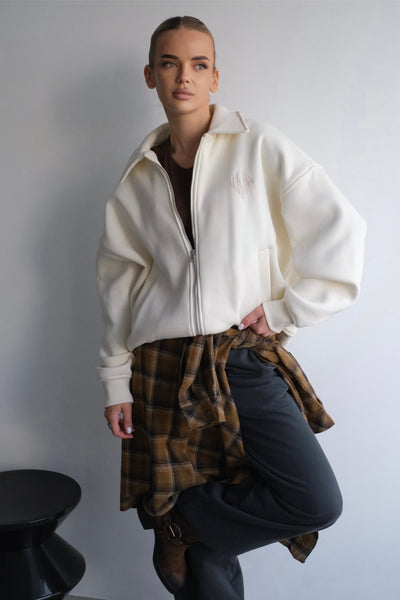 Oversized bomber with collar and zip closure. Soft texture and embroidered logo on the front add minimalistic sophistication