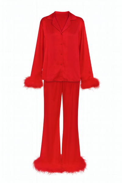 Loose-fit satin set featuring a button-down shirt and straight trousers. Soft feather trims along cuffs and hems add an airy, refined touch.