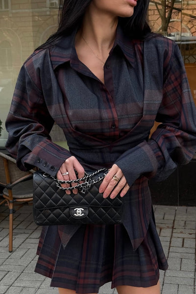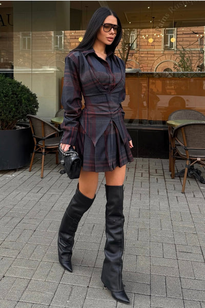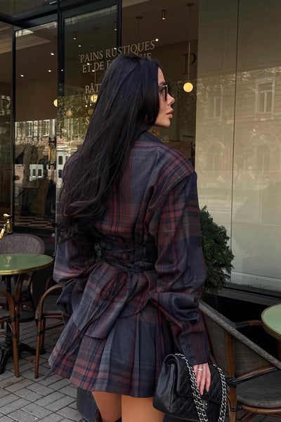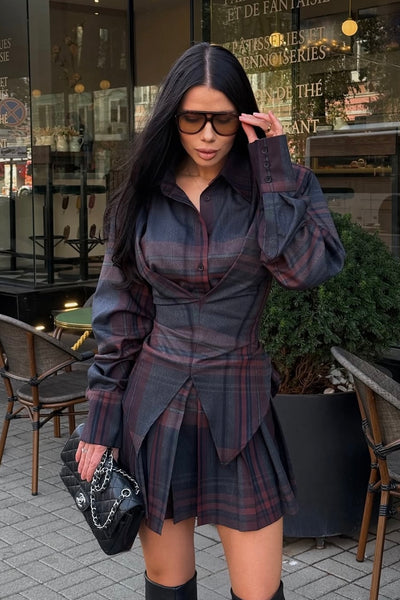 Plaid set consisting of a shirt and mini skirt. Straight-cut shirt with voluminous shoulders, elongated hem, and corset-style lacing at the back. Pleated wrap-effect skirt with regular waist.
